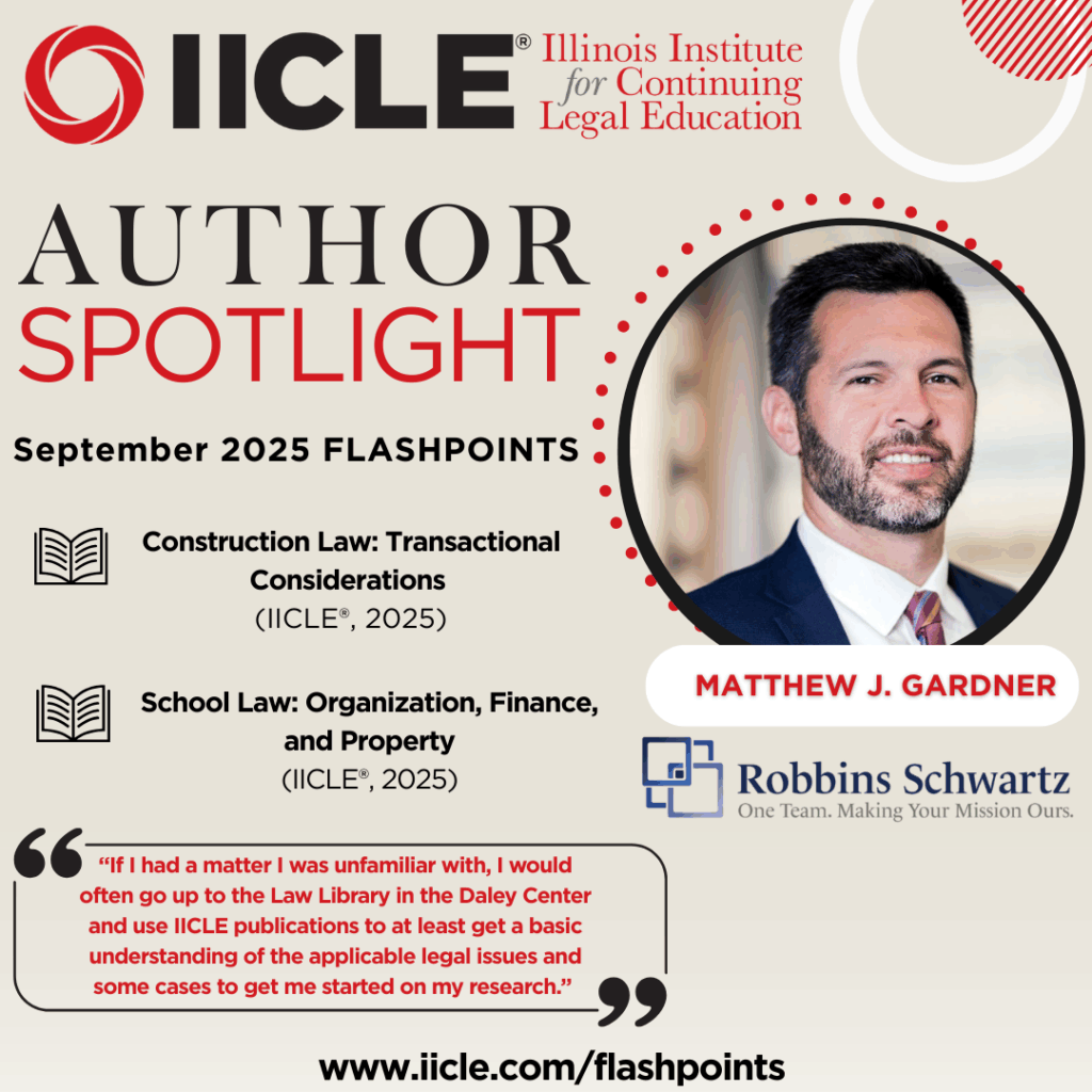 We are proud to share that Matthew J. Gardner has been recognized as the September 2025 IICLE FLASHPOINTS Author Spotlight. Matt recently served as a contributing author on Construction Law: Transactional Considerations (IICLE, 2025). He has also contributed to School Law: Organization, Finance, and Property since 2017.