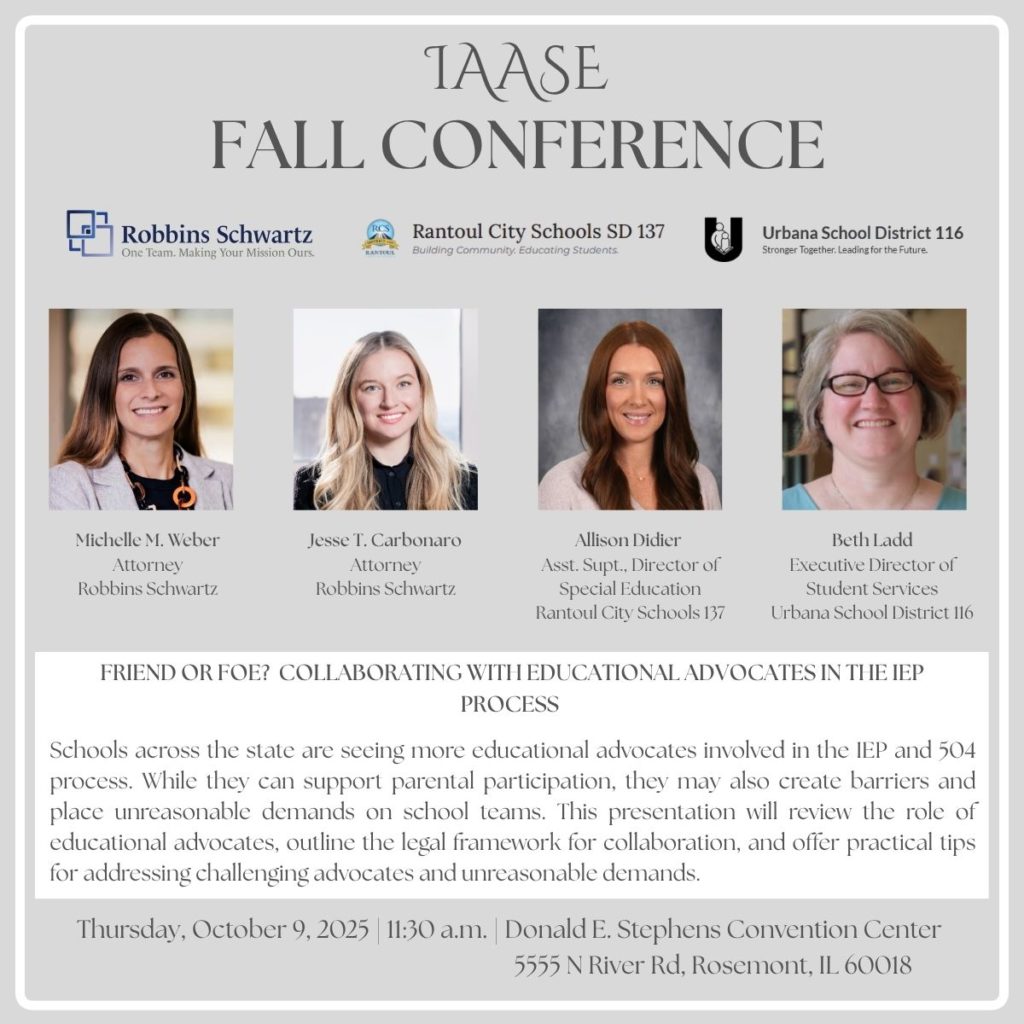 Now in Session! Are you attending the IAASE Fall Conference today? Stop in and hear from Robbins Schwartz team members alongside team members from Rantoul City Schools SD 137 and Urbana School District 116.